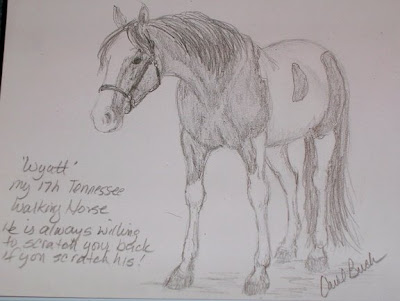 I belong to a great group of ebay horse artists called "Whoa". I had been thinking for a few weeks what we could do as a group project to help raise money for horses in need. One day I happened upon a website belonging to a group of artist friends. On that website they shared pictures from a sketchbook that they had been passing around across the country for several months. What a great idea, I thought! We could could all add some lovely original sketches to a book and auction it off on ebay to a charity we vote upon. So the idea came to fruition and we have a great group of 14 wonderful horse artists from the US and UK. We all have 5 pages to work our magic on and in the Fall we will choose a charity and auction off the one of a kind art book.